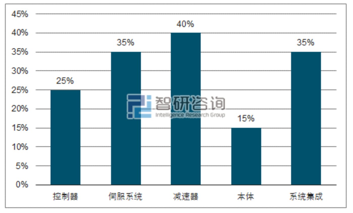 國外工業機器人巨頭本身就是核心部件的提供商,因此他們在零部件成本上擁有先天的成本優勢和技術優勢,另外他們往往能以巨大的采購量和簽署排他性協議獲得比較優惠的采購價格,而國內的中小企業在進口核心零部件時,往往要以高出國外廠商近3倍的價格購買減速器,以近2倍的價格購買伺服電機。